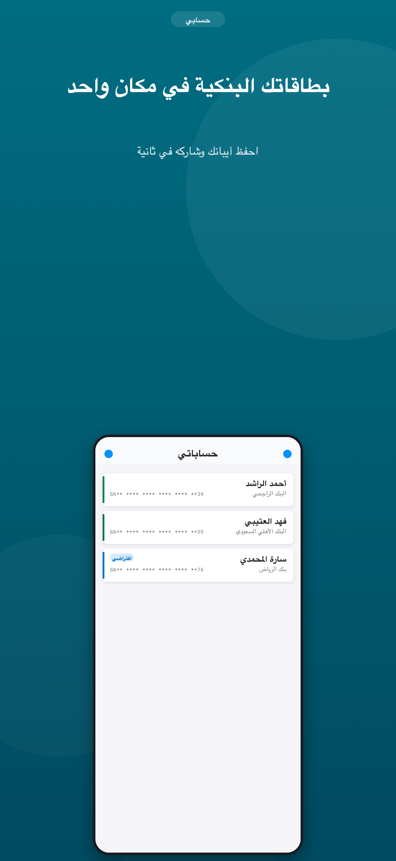 بطاقاتك البنكية السعودية في مكان واحد. شاركها كصورة أنيقة، نص منسّق، أو رمز QR — بدون فتح تطبيق البنك أبداً.