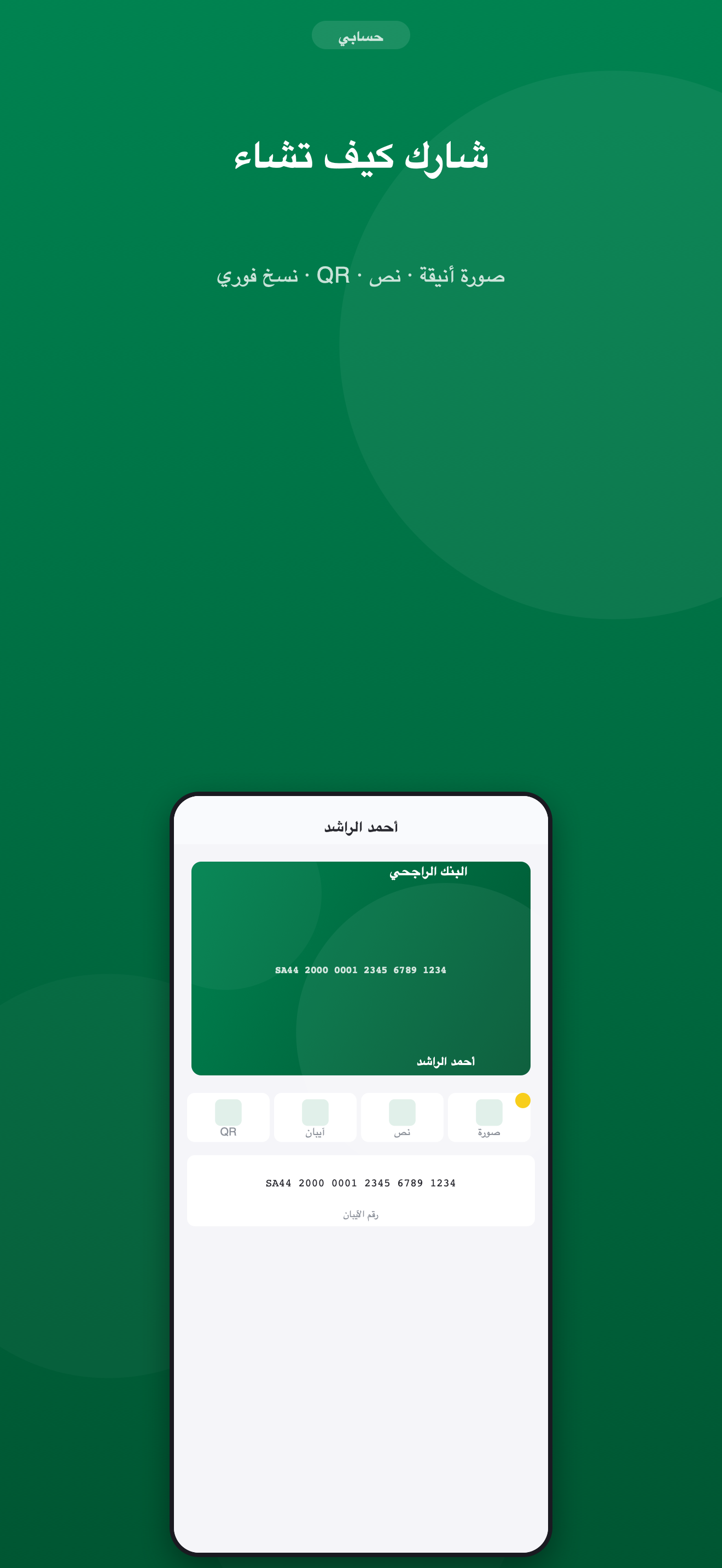 شارك آيبانك كصورة بطاقة جميلة تحمل ألوان وشعار بنكك — احترافية ومباشرة. لا حاجة لتصميم، التطبيق يتولى كل شيء.